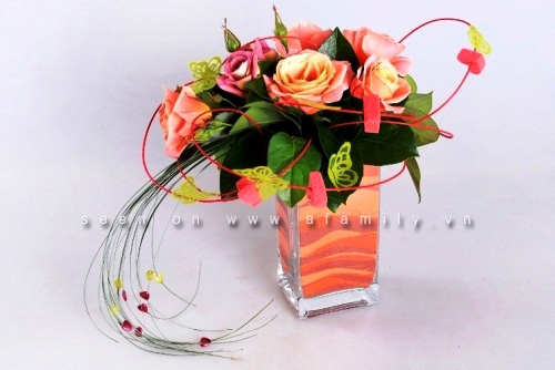 Tùy theo sở thích bạn có thể chọn những màu hoa khác nhau và chú ý chọn màu phụ liệu sao cho lọ hoa có màu sắc thật hài hòa mà sinh động. Nếu trang trí nhà cửa bạn nên chọn hoa hồng màu vàng hoặc màu cam, không gian trong nhà sẽ thêm tươi sáng.