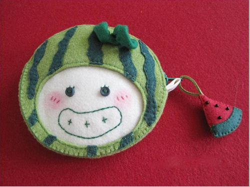 - Lật mặt sau, khâu qua với nửa quả dưa hấu còn lại với dây khóa kéo. Phần dây kéo thừa thì mình cắt đi nhé!