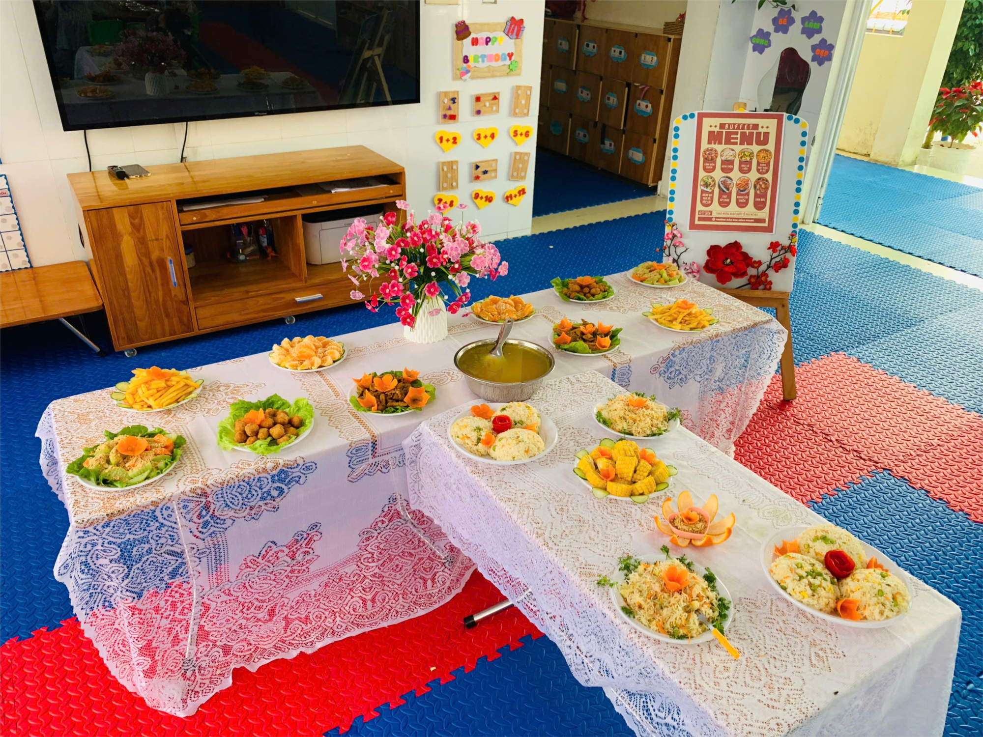Không khí buổi tiệc tràn ngập tiếng cười. Các bé cùng nhau xếp hàng lấy đồ ăn, ngồi ăn ngoan ngoãn và chia sẻ món ngon với bạn bè. Qua hoạt động này, các con được rèn luyện kỹ năng tự phục vụ, thói quen ăn uống lịch sự và tinh thần đoàn kết.