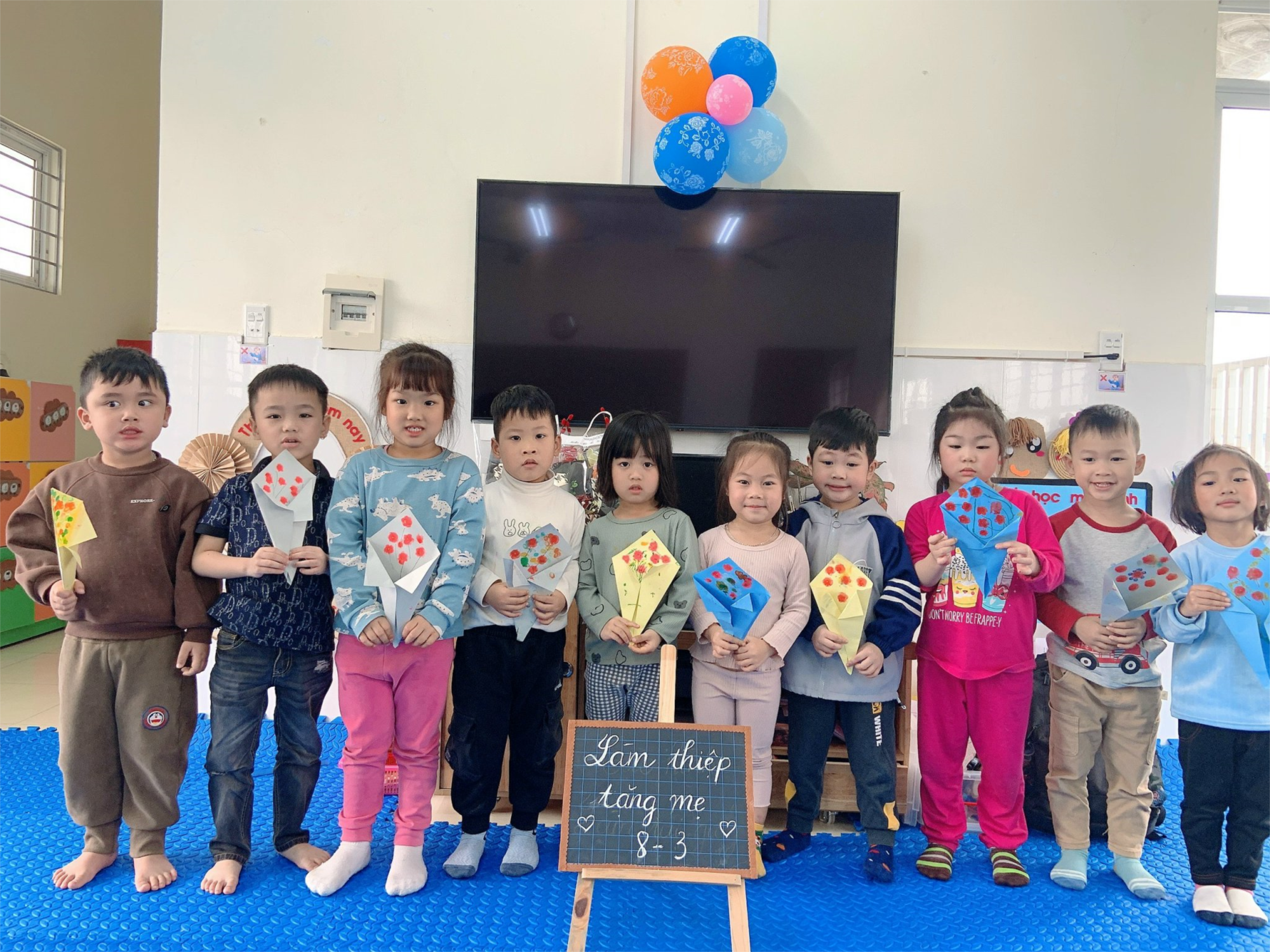 Ngày quốc tế phụ nữ 8.3 luôn là dịp để một nửa thế giới được đón nhận sự quan tâm và những lời yêu thương chân thành. Để góp một phần nhỏ hạnh phúc ngọt ngào mà các bà, các mẹ nhận được nhân ngày 8/3, lớp 4 tuổi B6 trường mầm Hồng Phong tổ chức cho các con tự làm thiệp 8/3 để dành tặng bà, tặng mẹ yêu thương.Với sự sáng tạo riêng, cô hướng dẫn bé làm những tấm thiệp tặng bà, tặng mẹ thật độc đáo kèm theo đó là những lời chúc yêu thương gửi đến mẹ : “ Chúc mẹ luôn mạnh khỏe “, “ Chúc mẹ vui vẻ, con yêu mẹ”,...