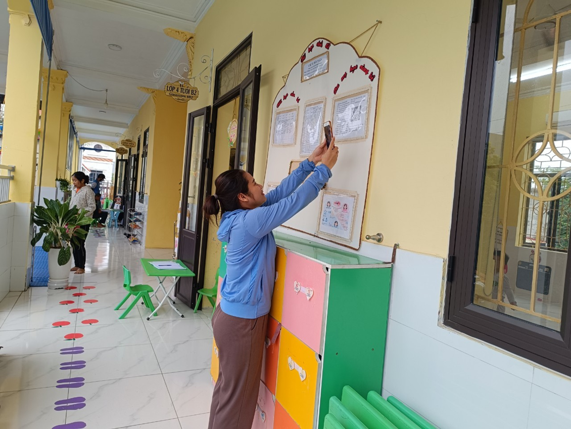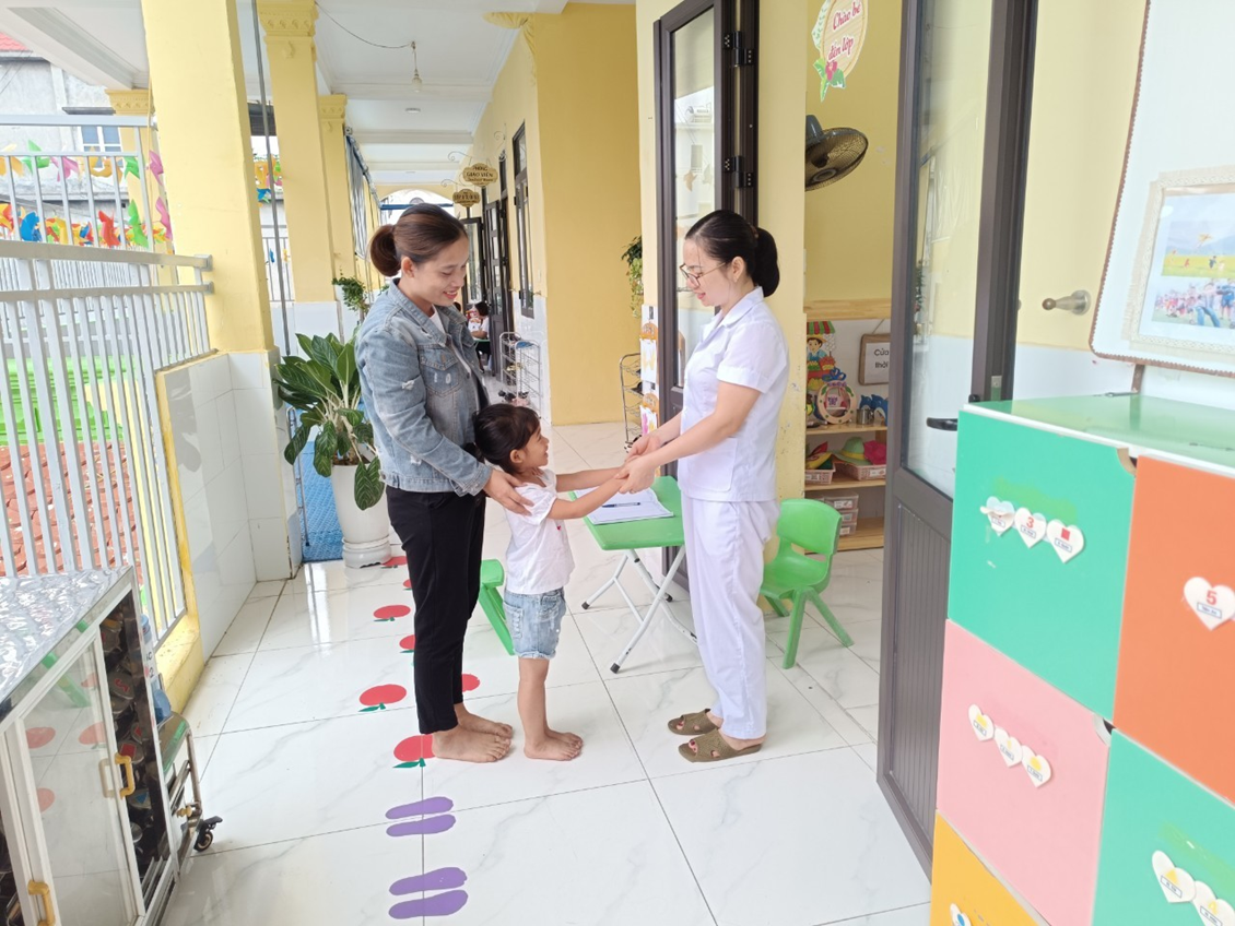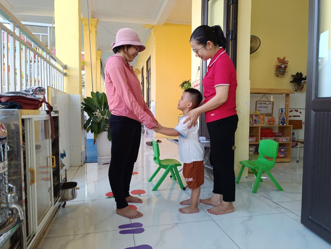Công tác đón và trả trẻ là một trong những nhiệm vụ được coi là quan trọng trong các hoạt động trong ngày vì đó là thời điểm mà giữa cô giáo và phụ huynh có thể trao đổi những thông tin cần thiết của trẻ để cô giáo nắm bắt được đặc điểm của từng trẻ trong ngày. Khi đón trẻ cô giáo luôn nhẹ nhàng với phụ huynh, ân cần, yêu thương với trẻ tạo cho trẻ có sự gần gũi hạnh phúc khi được đến lớp, để trẻ vui vẻ vào lớp. Nhắc nhở trẻ cất đồ dùng cá nhân đúng nơi quy định. Và phụ huynh kí sổ xác nhận tình trạng sức khỏe của trẻ khi cho trẻ đến lớp. Phụ huynh cùng con xem bài của con ở lớp, theo dõi bảng tuyên truyền về bài học của con khi ở lớp. Cô giáo trao đổi nhanh với phụ huynh về trang phục của trẻ khi đến lớp khi thời tiết giao mùa.