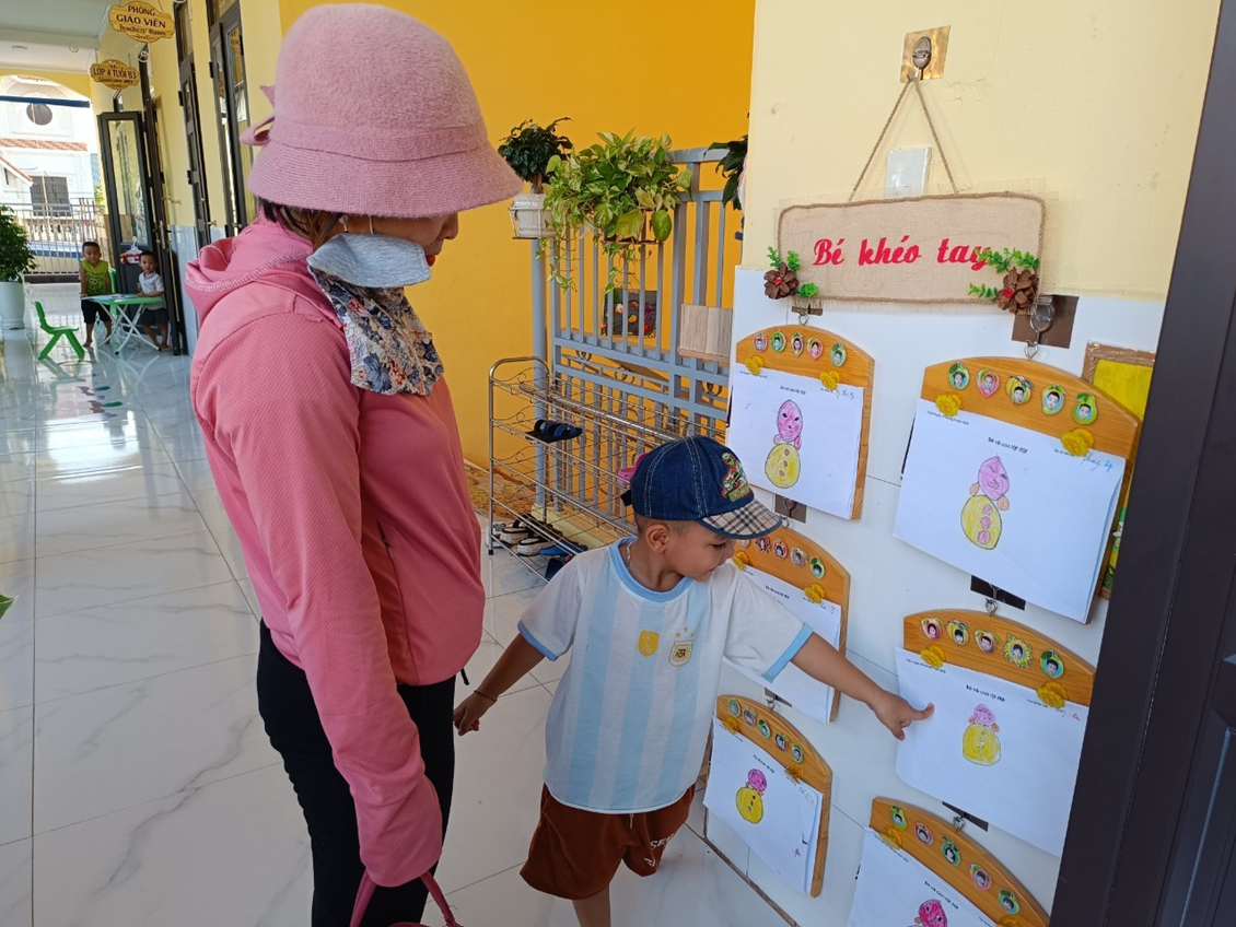 Phụ huynh cùng con xem bài vẽ của con ở lớp