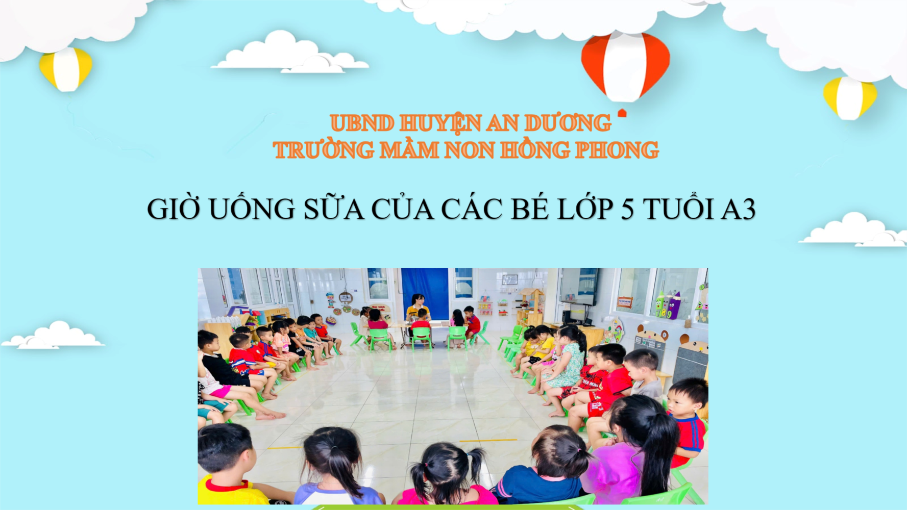 Hiểu được tầm quan trọng của việc ăn uống đủ chất nhằm nâng cao sức khỏe cho trẻ lứa tuối mầm non. Việc bổ sung dinh dưỡng phù hợp sẽ giúp góp phần tăng cường thể chất, thể lực, trí tuệ trong độ tuổi học đường – độ tuổi vàng của sự phát triển. Và dưới đây là các bé lớp MG 5 tuổi A3 với hoạt động uống sữa giữa giờ. Sau đây là hình ảnh trẻ uống sữa: