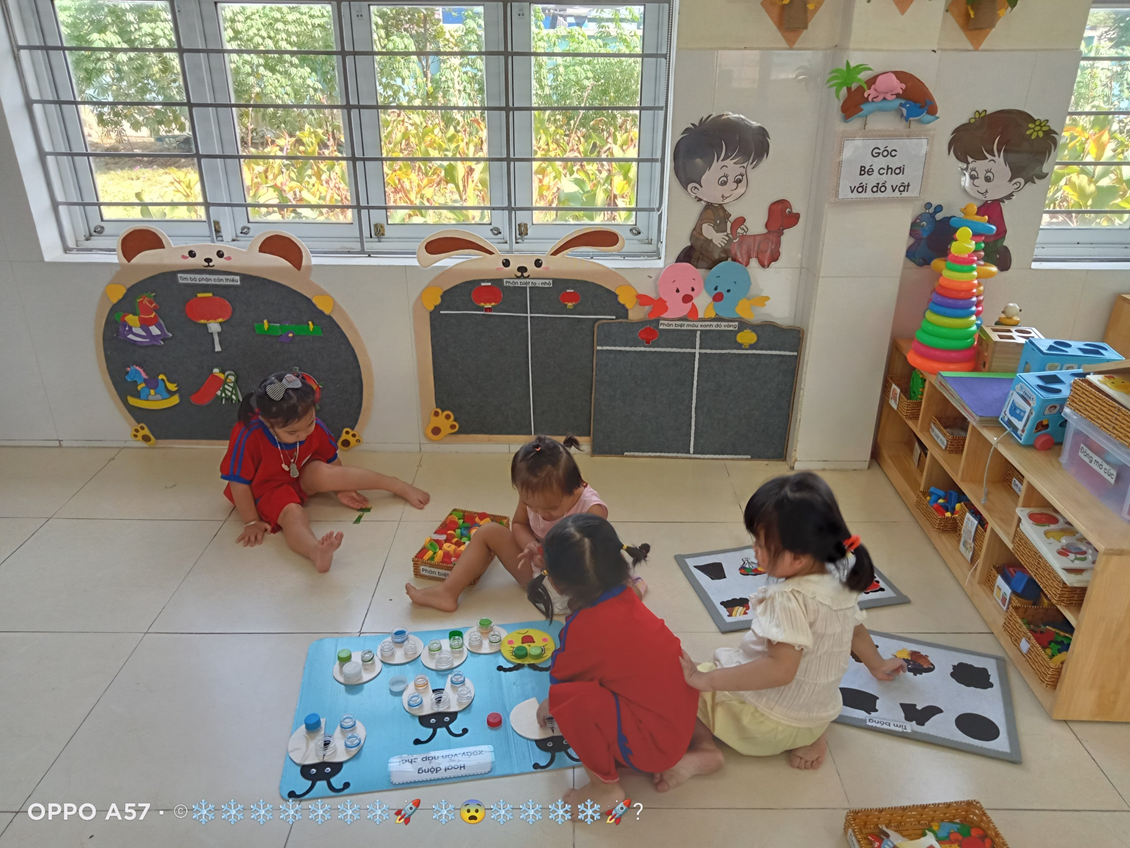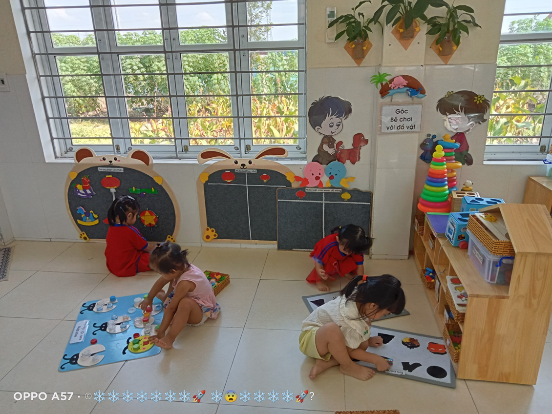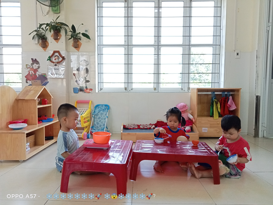 Với độ tuổi 24- 36 tháng, trẻ tham gia vào 4 góc chơi ở lớp như: Góc thao tác vai (trẻ bắt chước giả bộ các trò chơi: Nấu ăn, bế em,cho em ăn, ru em ngủ…).Góc chơi động (trẻ chơi kéo xe, thả bóng-bi, câu cá, tung bóng…).Góc chơi tĩnh ( trẻ chơi lồng hộp, tìm bóng, phân biệt màu,…). Góc nghệ thuật ( Xem tranh ảnh, kể chuyện bằng rối, tô màu, nặn…). Ở mỗi góc chơi trẻ được học những kiến thức, kỹ năng khác nhau và quan trọng hơn cả là trẻ có cơ hội được thể hiện mình và biết phối hợp cùng bạn khi tham gia các hoạt động.