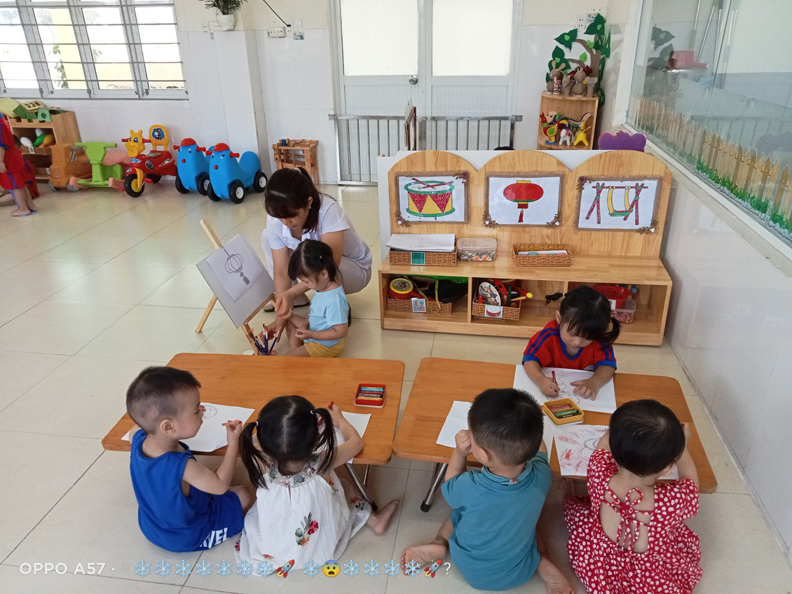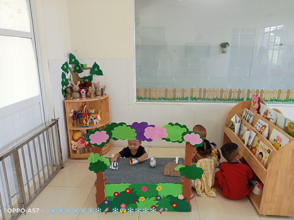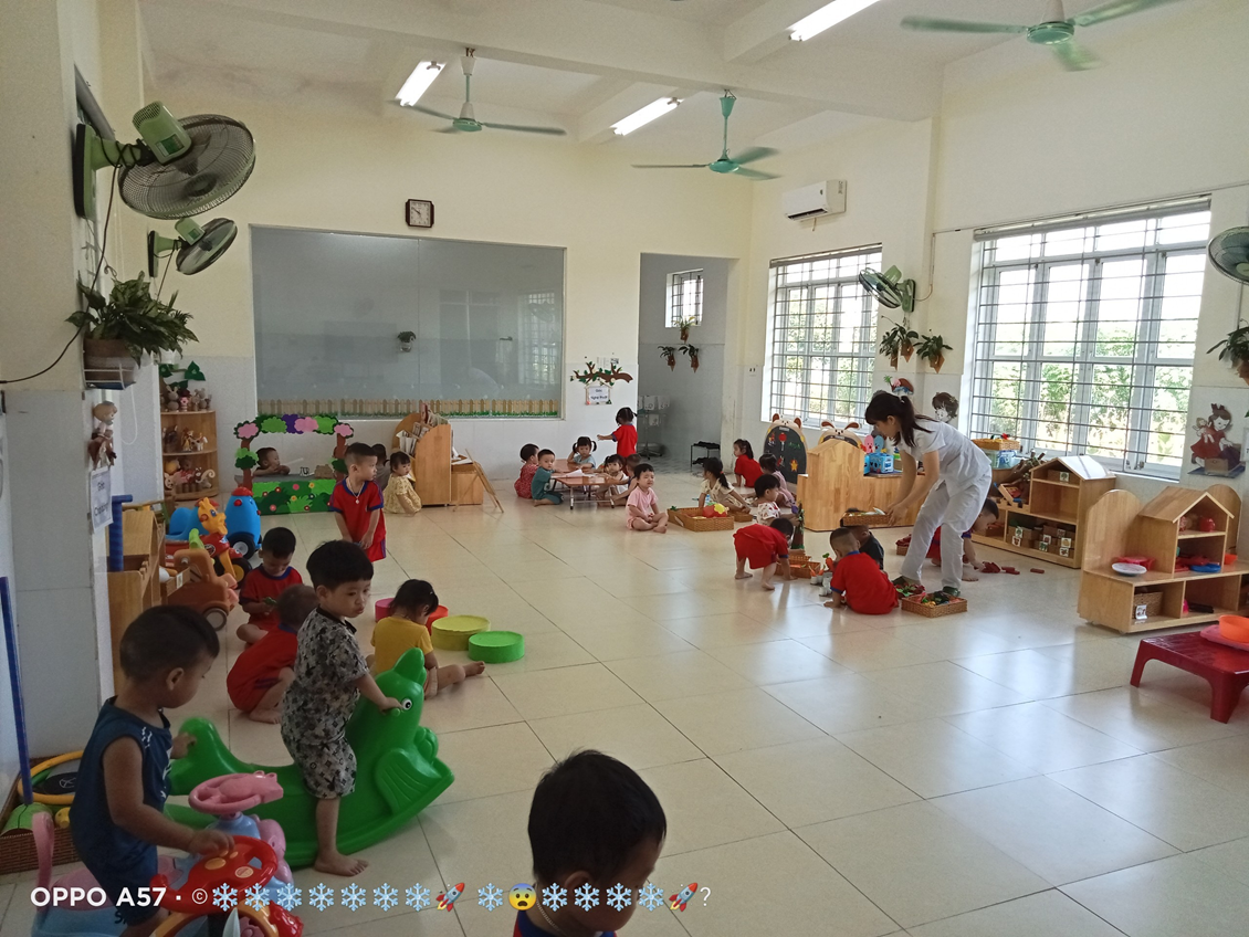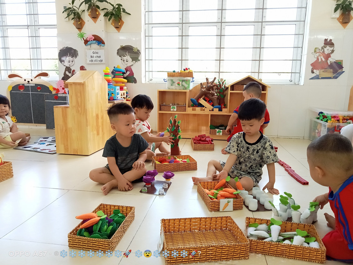 Với độ tuổi 24- 36 tháng, trẻ tham gia vào 4 góc chơi ở lớp như: Góc thao tác vai (trẻ bắt chước giả bộ các trò chơi: Nấu ăn, bế em,cho em ăn, ru em ngủ…).Góc chơi động (trẻ chơi kéo xe, thả bóng-bi, câu cá, tung bóng…).Góc chơi tĩnh ( trẻ chơi lồng hộp, tìm bóng, phân biệt màu,…). Góc nghệ thuật ( Xem tranh ảnh, kể chuyện bằng rối, tô màu, nặn…). Ở mỗi góc chơi trẻ được học những kiến thức, kỹ năng khác nhau và quan trọng hơn cả là trẻ có cơ hội được thể hiện mình và biết phối hợp cùng bạn khi tham gia các hoạt động.