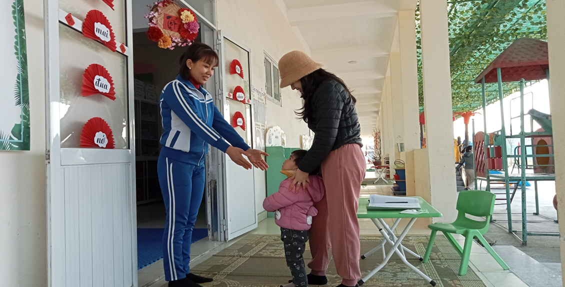 Buổi sáng bé được người thân trong gia đình đưa đến trường mầm non cùng cô và các bạn. Thời điểm này phụ huynh trao đổi với cô giáo tình hình sức khoẻ ở nhà của bé. Đây cũng là lúc các cô giáo mầm non dạy cho các bé cách chào hỏi lễ phép.
