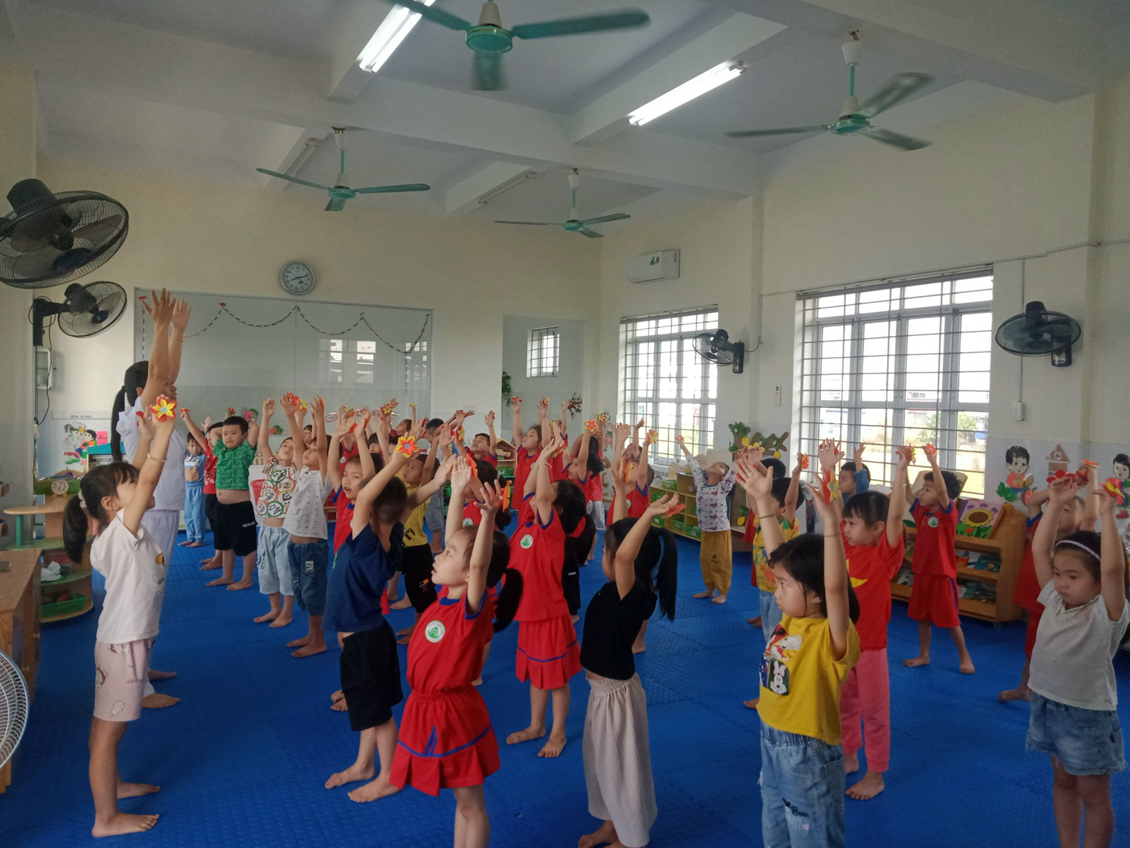 Các bé được luyện tập những động tác thể dục sáng nhẹ nhàng, tạo tâm thế vui vẻ, phấn khởi chuẩn bị cho một ngày mới hoạt động ở trường.