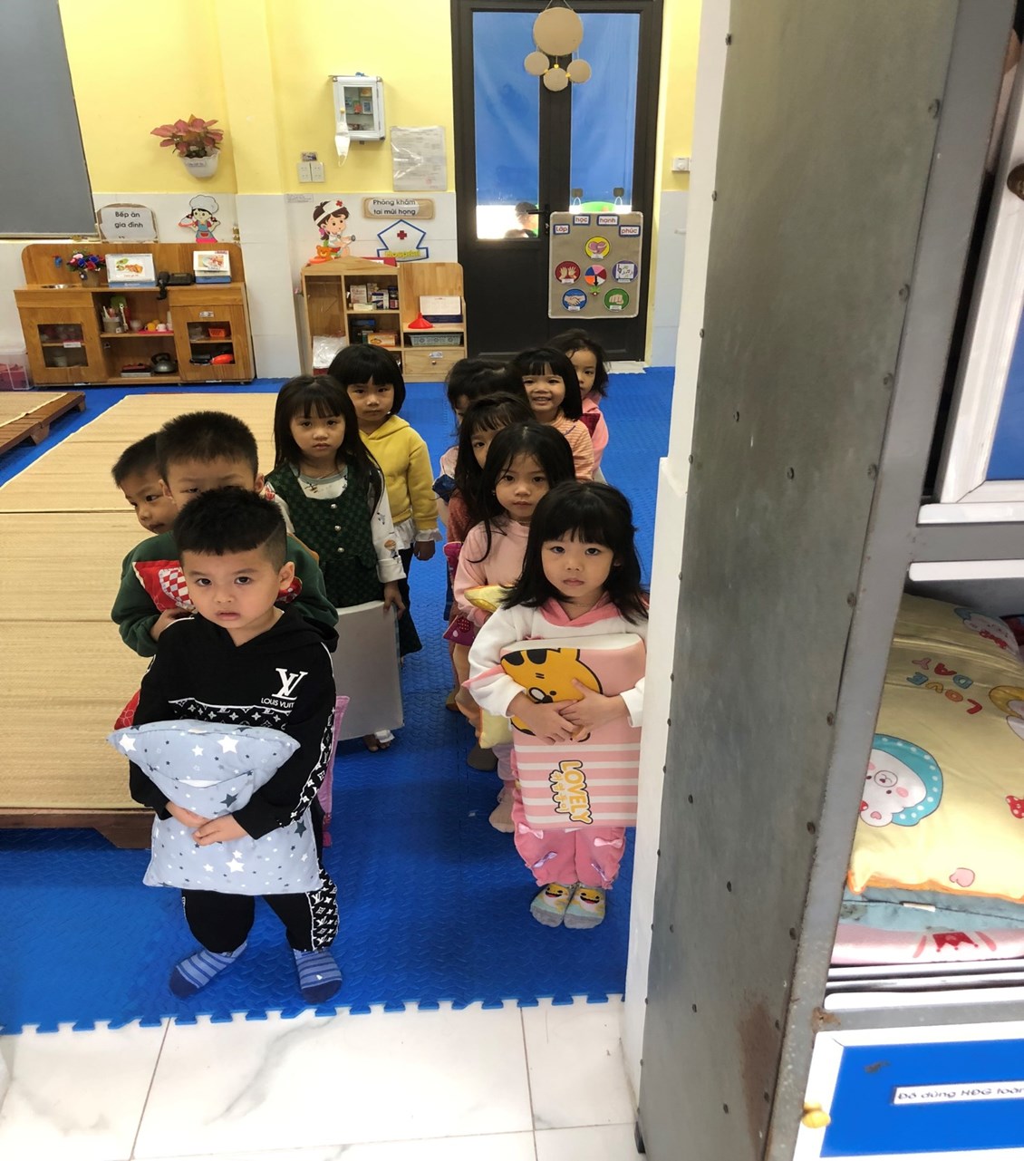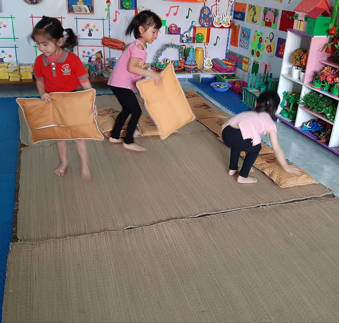 - Chuẩn bị đầy đủ đồ dùng phục vụ cho giờ ngủ của trẻ, hướng dẫn trẻ kĩ năng tự lấy đồ dùng như: Dát giường, chiếu, gối, chăn… .chuẩn bị cho giờ ngủ của các bé lớp 4B1.