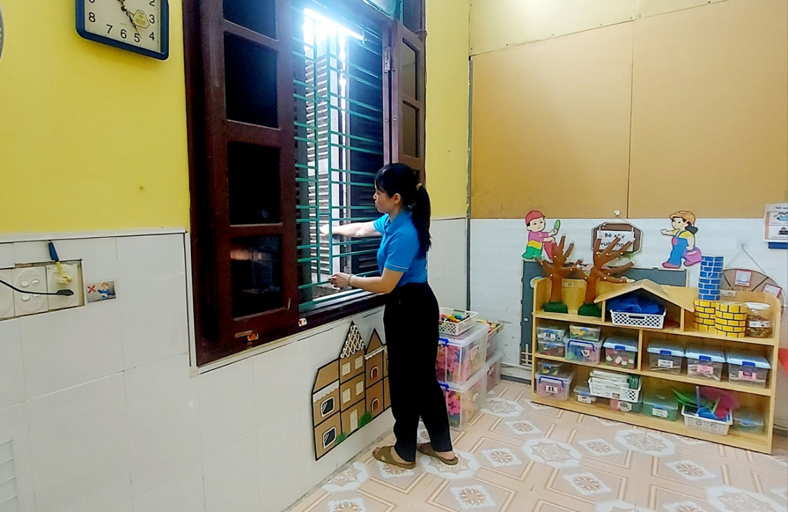 Để giảm ánh sáng trong phòng giúp trẻ dễ đi vào giấc ngủ và ngủ ngon giấc cô giáo tắt bóng điện và đóng cửa sổ, cửa ra vào.