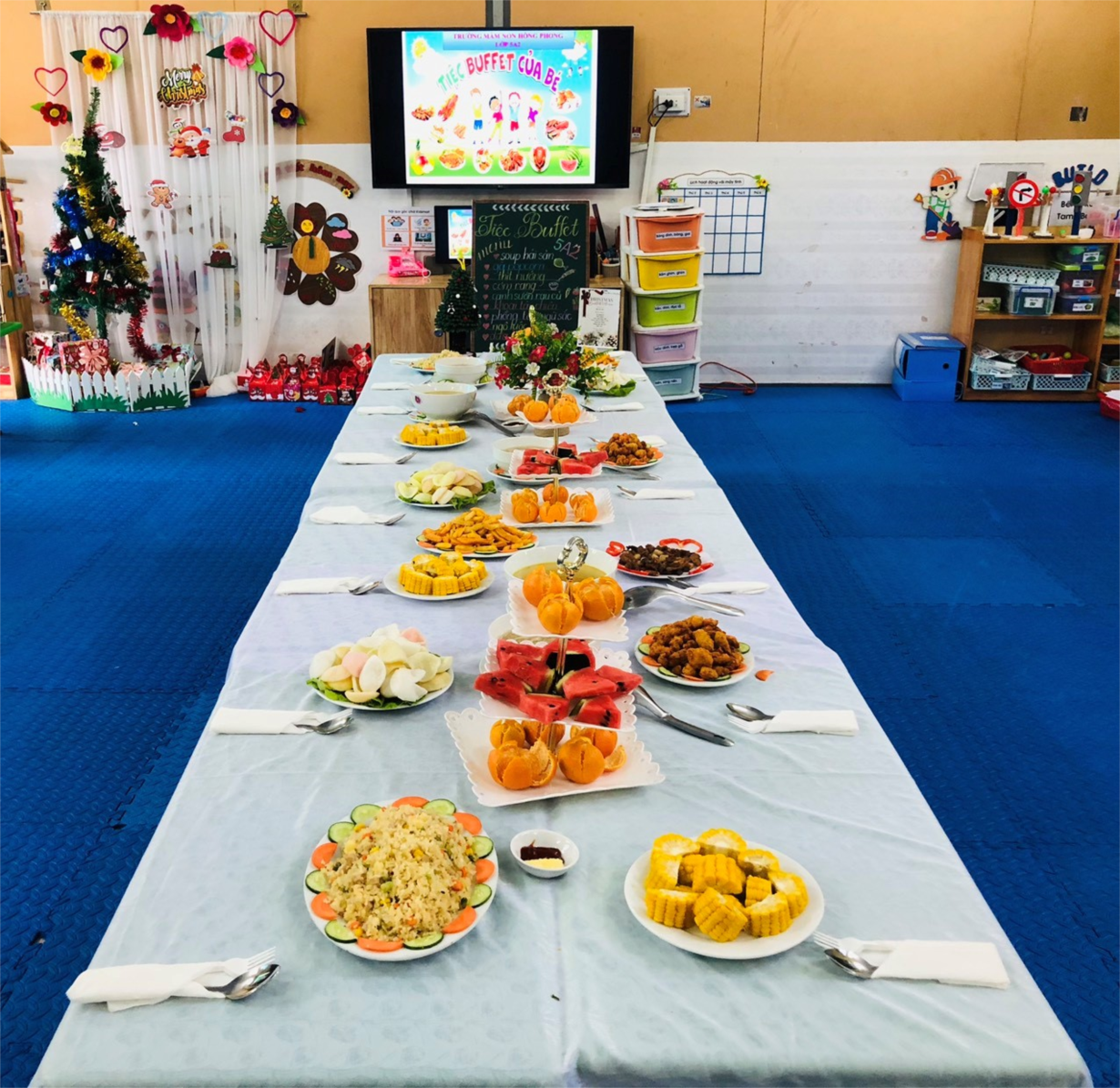 Sáng ngày 20/12/2023 (Thứ 4) lớp 5A2 phối hợp với cha mẹ của trẻ tổ chức tiệc Buffet để tăng cường nâng cao chất lượng bữa ăn học đường cho trẻ trong trường mầm non và chuyên đề “Xây dựng trường mầm non lấy trẻ làm trung tâm”. Qua bữa tiệc buffet trẻ được giao lưu trao đổi ngắm nhìn, nhận biết các món ăn vừa lạ vừa quen do cô và mẹ chế biến nghộ nghĩnh dưới nhiều hình thức khác nhau để khuyến khích các con ăn ngon miệng như: Súp hải sản, Gà Poccon, thịt nướng, cơm rang thập cẩm, canh sườn bí xanh, cà rốt, khoai tây chiên, phồng tôm ngũ sắc, dưa hấu, quýt….